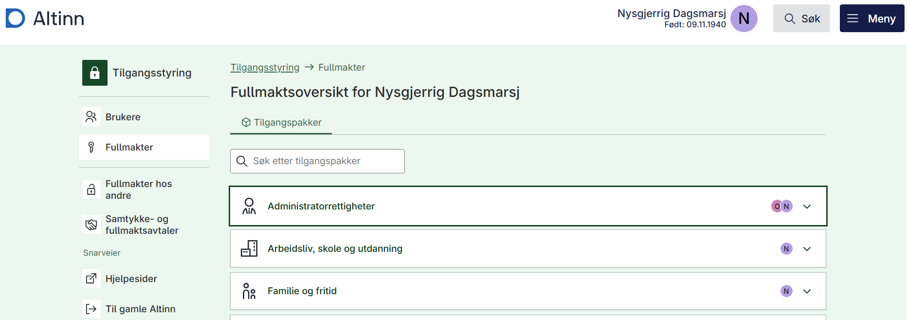 Hvis du velger "Fullmakter" i venstremenyen, ser du en oversikt over alle områdene med tilgangspakker du som privatperson har fullmakt til.