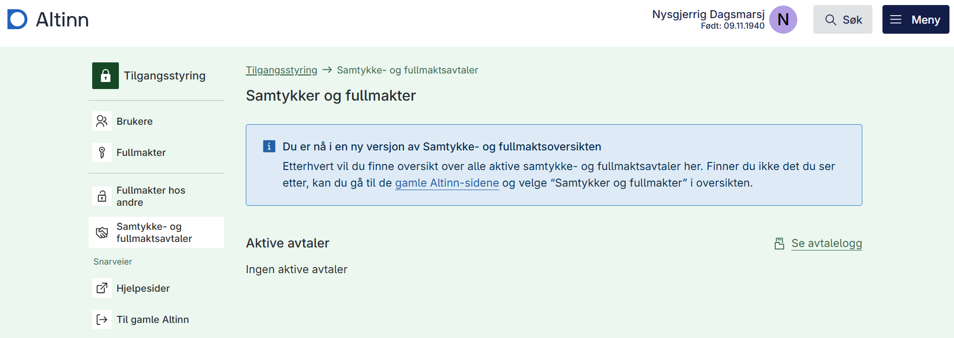 Hvis du velger "Samtykker og fullmaktsavtaler" vil du etterhvert finne oversikt over alle aktive samtykke- og fullmaktsavtaler. Finner du ikke det du ser etter, kan du gå til gamle Altinn og velge “Samtykker og fullmakter” i oversikten.