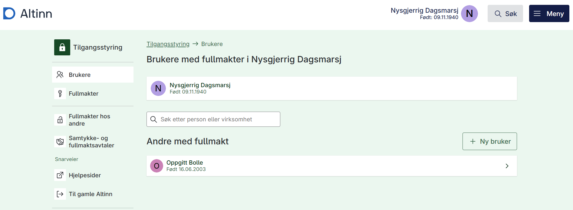 Hvis du velger snarveien eller venstremenyen “brukere” kommer du til siden der du ser hvem du har gitt fullmakt til.
